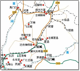 运城,古称河东,位于山西省西南部,地处晋陕豫黄河“金三角”地区,与河南省三门峡市、陕西省渭南市隔河相望,是中华民族和中华文明的重要发祥地之一。春秋时统属晋国,晋献公于公元前669年定都于绛(今绛县)。韩、赵、魏三家分晋后,运城属魏,当时,魏国的都城在安邑(今夏县禹王城一带)。秦始皇统一中国,设36郡,运城属河东郡,治所安邑。以后两千多年,建置频繁,但一直沿用“河东”这一称谓。运城,因“盐运之城”而得名,它是中国唯一一座因盐而建立起来的城市,史称“盐运专城”。