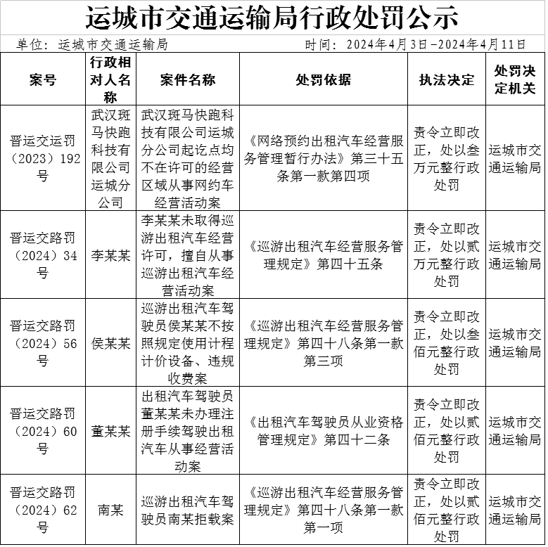 运城市交通运输局行政处罚公示(2024年4月3日-2024年4月11日)