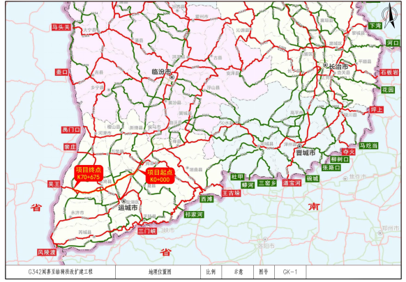 项目起点位于闻喜县郭家庄镇辛庄村,顺接在建国道342线闻喜县城过境改线工程终点,路线沿既有国道342布设,进入夏县后,经水头镇,于马乔村西南分别下穿大西高铁、侯平高速后,经东张村进入盐湖区,在盐湖区境内,路线沿上马水库北侧布设,经王范乡、冯村乡,于中阳村转向向南,跨越涑水河后进入北相镇,在店上村东上跨省道运稷线后,路线转向西南,经泓芝驿镇进入临猗县,在临猗县境内经楚侯乡、牛杜镇,在杨妃村西上跨国道209后,路线沿临猗县城规划边界向西布设,经猗氏镇,在临猗西收费站南侧接既有国道342,后路线沿旧路布设,利用呼北高速和浩吉铁路既有桥梁下穿通过,经上朝村后偏离旧路在嵋阳镇北侧绕行,于白堂村南侧顺接旧路后,继续沿旧路布设,于景家卓村偏离旧路向西北绕行至临晋镇北侧,后路线继续向西南布设,终点位于角杯乡西齐永北,既有国道342与省道小风线平交处,路线全长70.675公里。