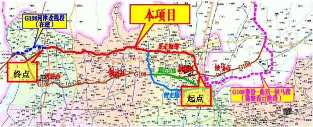 项目途经山西省临汾地区侯马市、运城地区新绛县、稷山县、河津市四县市。起点位于临汾地区侯马西站南侧,路线顺接G108襄汾-曲沃-侯马改线段终点,路线向西沿原G108线布线,在大西高铁西侧,通过改造原G108侯马互通段主线段线位,在满足本项目设计标准的同时,实现本项目与侯平高速的连接。路线继续向西布设,沿旧路下穿侯平高速后在新绛县狄庄北侧路线折向西北,路线上跨汾河后与新绛县九原大道设置互通立交相连接,后向西北跨越S232及京昆高速后,路线继续向西布线,经过三泉镇、王守庄、梁村、光马村、马首官庄后进入稷山县境内,路线继续向西布设,经西社镇李老庄北、刘家庄堡北、设置互通立交上跨S233后路线继续向西经泰山村南、麻参坡南、肖家庄村南、路村庄北、宁翟北、阳平北后,向西上跨呼北高速后进入河津市进内,路线向西在小张村南设互通立交与规划的G209改线项目交叉,后路线继续向西,经贺家巷村南、李家堡村北后在寺庄村到达本项目终点,设寺庄枢纽与现有G209交叉,终点顺接G108河津改线段起点。路线全长57.803km。