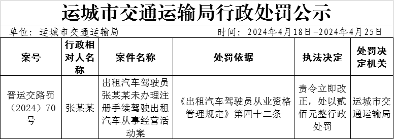 运城市交通运输局行政处罚公示(2024年4月18日-2024年4月25日)
