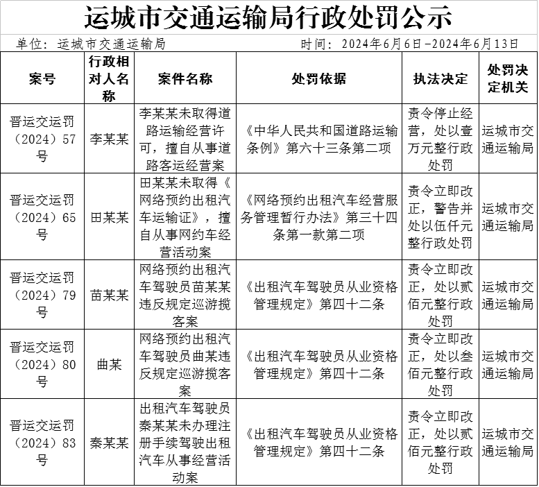 运城市交通运输局行政处罚公示(2024年6月6日-2024年6月13日)