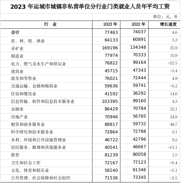 2023年运城市城镇非私营单位就业人员年平均工资为77463元,比上年增加3426元,名义增长[1]4.6%。扣除价格因素,实际增长4.3%。在岗职工年平均工资为79823元。