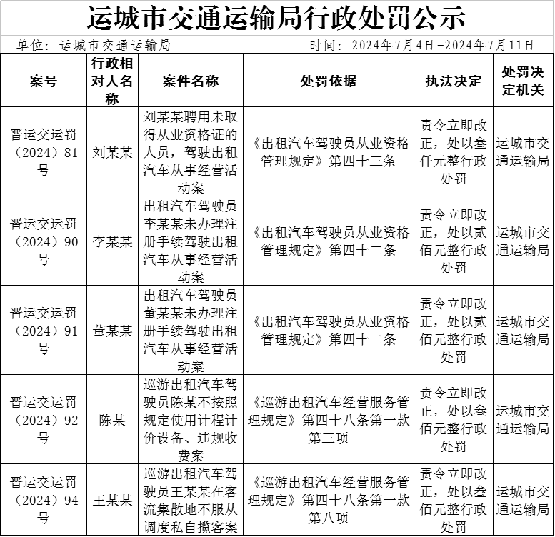 运城市交通运输局行政处罚公示(2024年7月4日-2024年7月11日)
