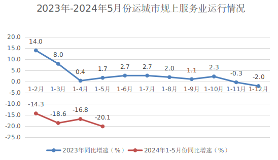 近年来,运城市紧扣高质量发展主题,连续不断出台一系列加快服务业发展的政策措施,为规上服务业的发展提供了制度保障以及良好的市场环境。全市规上服务业发展进入了新发展阶段,经济规模不断扩大,从2023年统计数据来看,全市规上服务业实现营业收入229.8亿元,营业收入接近230亿。从实现营业收入增长速度来看,呈现持续走低态势,从2023年1-2月份营业收入同比增长14.0%到2023年1-11月份首次出现负增长,降幅达14.3个百分点,受交通运输主导行业运行趋势影响,2024年全市规上服务业总体发展依然呈回落趋势,重点行业复苏步伐缓慢。