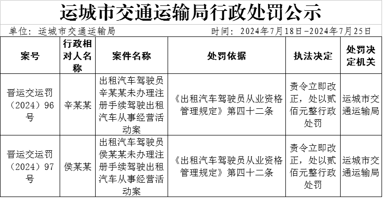运城市交通运输局行政处罚公示(2024年7月18日-2024年7月25日)
