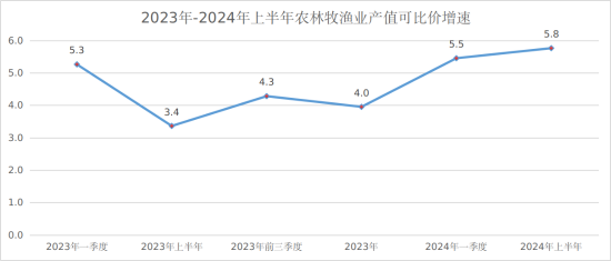 分行业看,上半年农林牧渔业总产值主要以农业和牧业为主,累计占农林牧渔业总产值比重达81.9%。其中,农业产值完成124.6亿元,占农林牧渔业总产值的比重达到58.6%,增长6.2%,上拉农林牧渔业总产值增速3.7个百分点;林业产值完成12.6亿元,占比5.9%,下降6.1%,下拉农林牧渔业总产值增速0.5个百分点;牧业产值完成49.4亿元,占比23.3%,增长8.5%,上拉农林牧渔业总产值增速1.9个百分点;渔业产值完成2.1亿元,占比1.0%,增长8.0%,上拉农林牧渔业总产值增速0.1个百分点;农林牧渔专业及辅助性活动产值完成23.8亿元,占比11.2%,增长5.6%,上拉农林牧渔业总产值增速0.6个百分点。