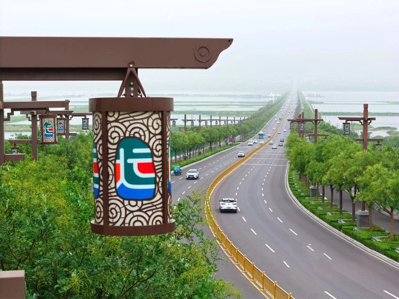 随着城市的发展,不仅止于带来光明,越来越多带有寓意、装饰观赏性强的路灯出现在城市街道。红旗街(圣惠路至学苑路)、禹都街、机场大道的“鹰击长空”,安装的灯具采用了仿生设计手法,以展翅翱翔的雄鹰入手,外观设计线条流畅、美观大方,充满现代设计感,寓意城市发展锐意进取、腾飞翱翔。同时,这些街道还设有辅光源灯箱,大大提升了夜间亮化的色彩层次,从远处观看,两排路灯犹如列队的雄鹰,将城市的夜晚装点得焕然一新。