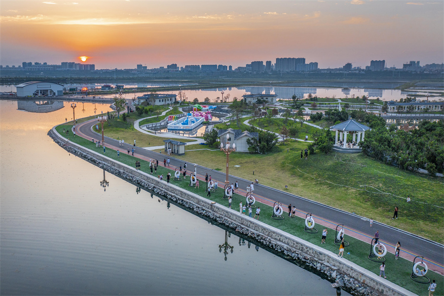 8月18日,市民在运城盐湖景区休闲纳凉。 近期傍晚时分,众多市民选择在运城盐湖景区沿岸亲水平台的绿地上席地而坐,休闲纳凉。景区向公众开放以来,凭借其独特的区位优势,成为市民望山亲水的打卡新去处。记者 茹雅 摄