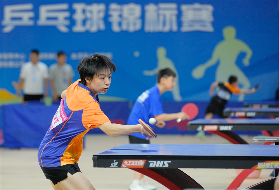 8月19日,由省体育局主办的2024年山西省乒乓球锦标赛在永济市体育中心拉开战幕,来自全省11个市20支代表队500余名青少年运动员同场竞技。此次比赛为期5天,赛事按年龄分为甲、乙、丙、丁4个组别,设男子单打、女子单打、男子双打、女子双打、混合双打、男子团体、女子团体等项目。 图为选手在赛场上进行激烈对决。