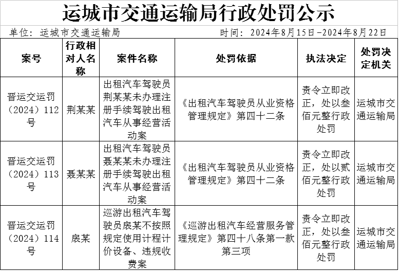 运城市交通运输局行政处罚公示(2024年8月15日-2024年8月22日)