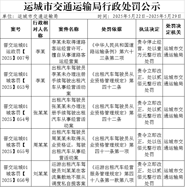 运城市交通运输局行政处罚公示(2025年5月22日-2025年5月29日)