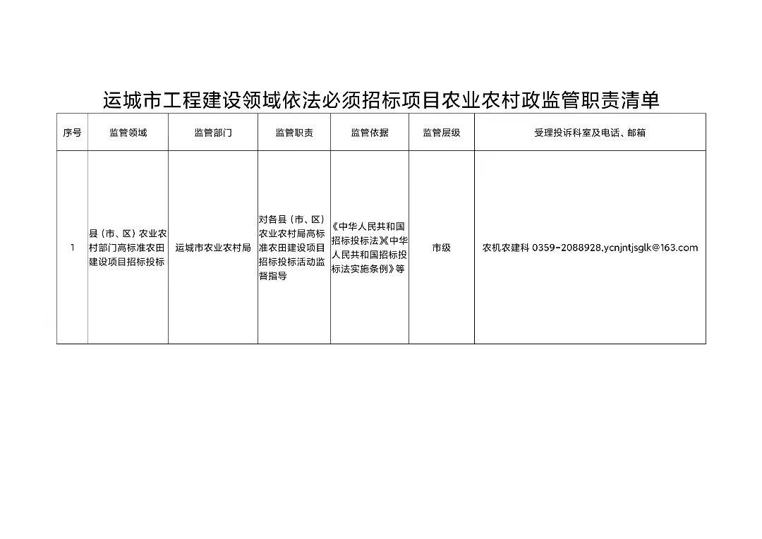 运城市工程建设领域依法必须招标项目农业农村政监管职责清单