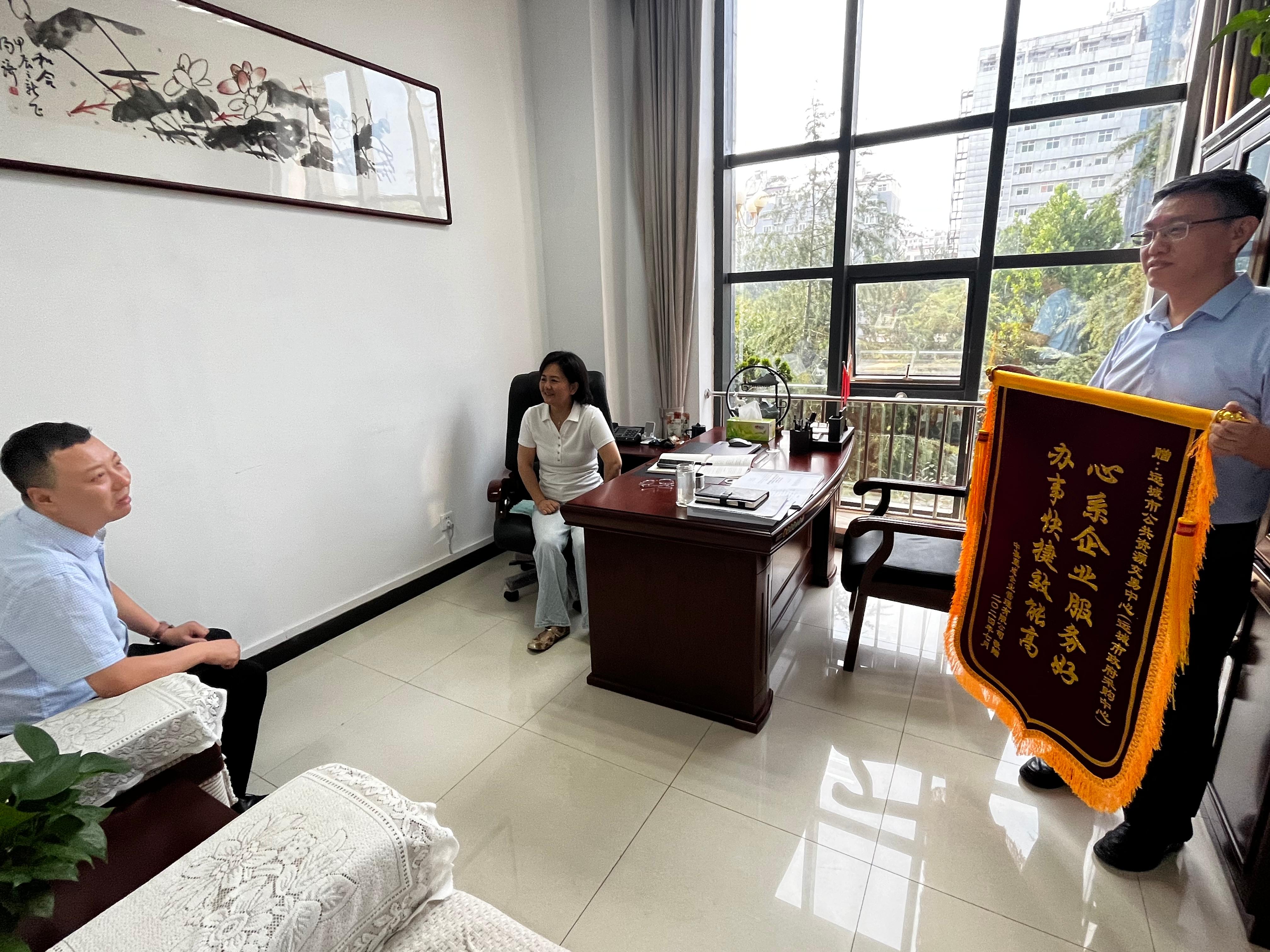 7月1日上午,正逢建党103周年,中嘉至成企业管理有限公司经理将一面印有“心系企业服务好,办事快捷效能高”字样的锦旗送到市公共资源交易中心,对中心在交易开评标服务工作中提供的“延时”“周到”服务表示感谢。