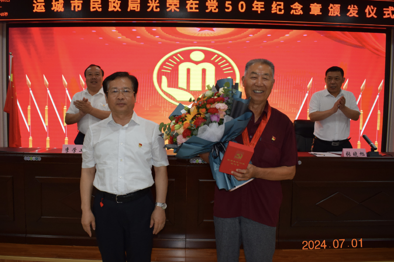 五十载峥嵘岁月,五十载初心如磐。7月1日,市民政局党组书记、局长杨建庭为老党员韩胜利颁发“光荣在党50年”纪念章。小小的纪念章闪耀着老党员无悔的忠诚,印证着老党员无言的奉献,镌刻着老党员无声的坚守,是老党员坚定理想信念和优良作风的一种传承,激励老党员为广大年轻党员干部树好榜样、立好标杆、当好表率。