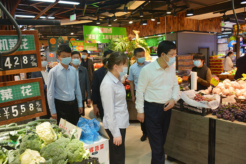 薛永琦一行先后了解了百惠超市场所码扫码、行程码查验、体温检测、佩戴口罩、有无专人负责等疫情防控措施落实情况;现场查看了肉蛋奶、蔬菜、冷链冻品等百姓生活必需品的供应、价格、质量、食品安全等情况。