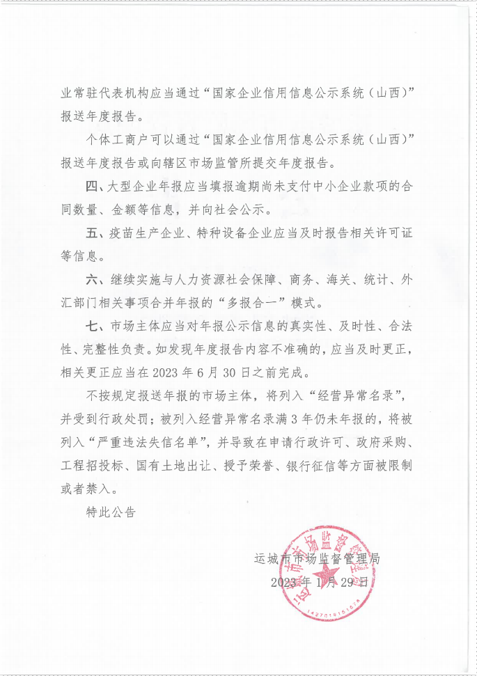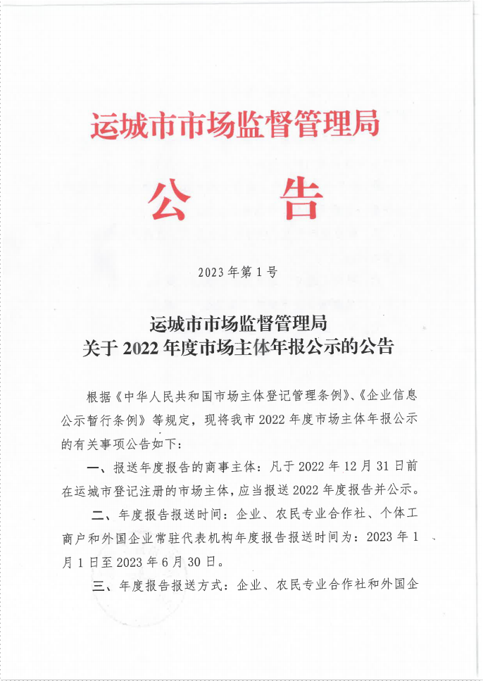 运城市市场监督管理局关于2022年度市场主体年报公示的公告