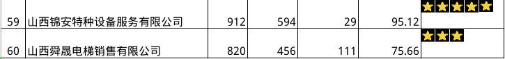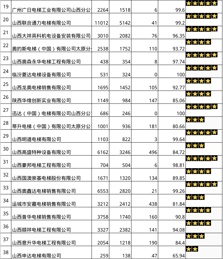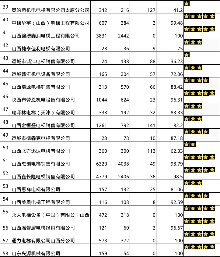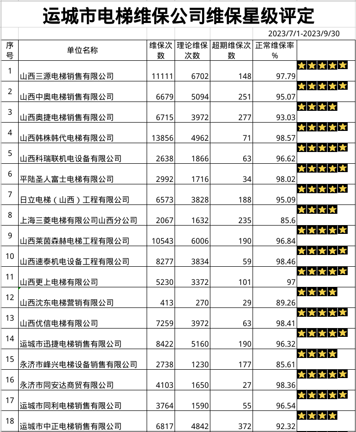 2023年第三季度运城市电梯维保公司维保质量星级评定
