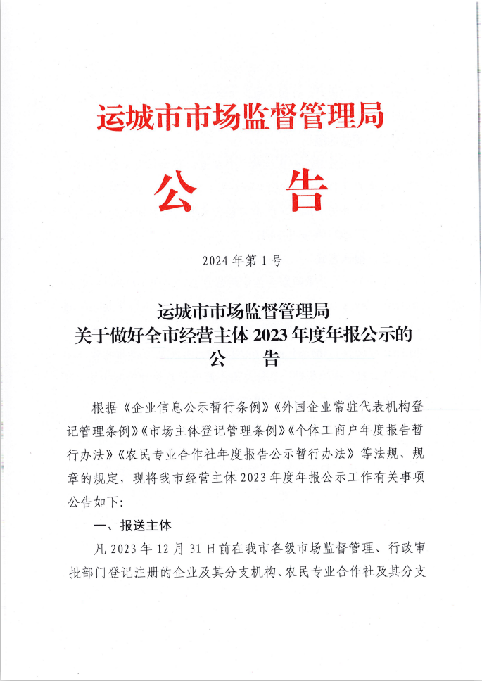 运城市市场监督管理局关于做好全市经营主体2023年度年报公示的公告