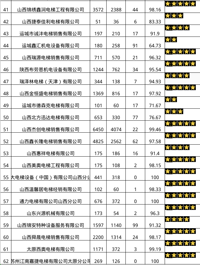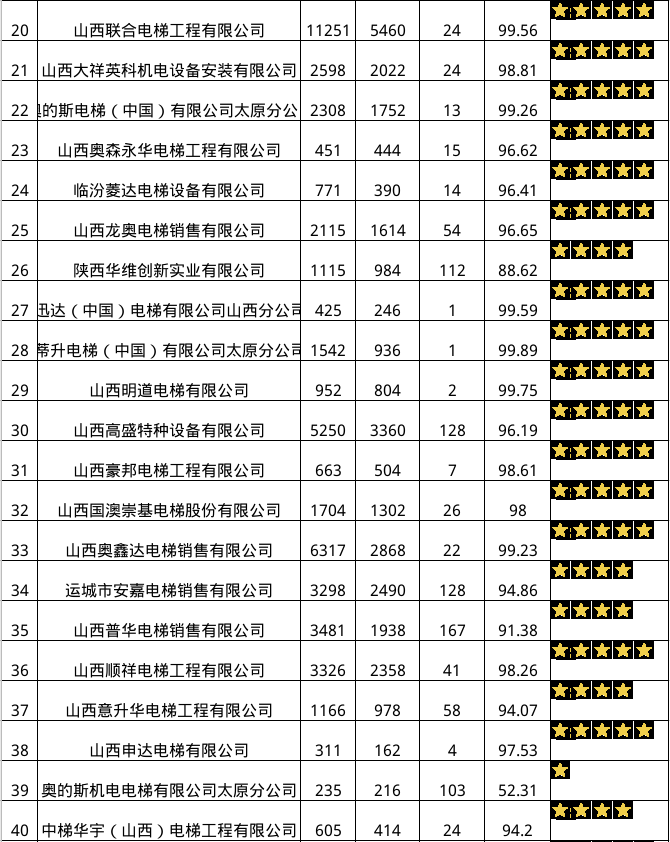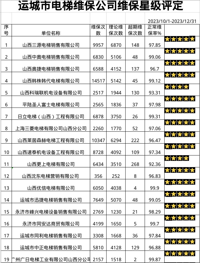 2023年第四季度运城市电梯维保公司维保质量星级评定