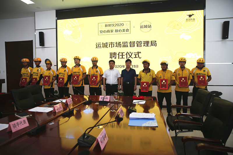 在备忘录签署会上,市市场监管局聘请美团外卖配送员成为社会监督员并颁发聘书,送餐骑手代表做“践行承诺 共治共享食品安全”宣誓表态,承诺将食品安全放在首位,提供优质的餐餐饮配送服务。这标志着骑手将会在以后的食品配送服务中心将配合政府职能部门监督食品及餐饮安全隐患,为运城网络餐饮安全监管再多份保障。