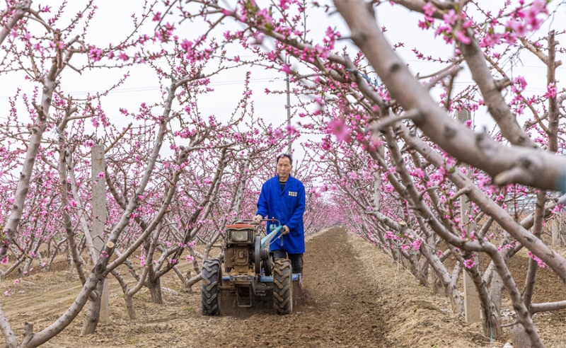 3月26日,春回大地,气温回升,永济市卿头镇东安头村万亩桃花竞相绽放。当地桃农抢抓农时,在桃园犁地施肥、旋耕除草,一派繁忙景象。特约摄影 杨建峰 摄