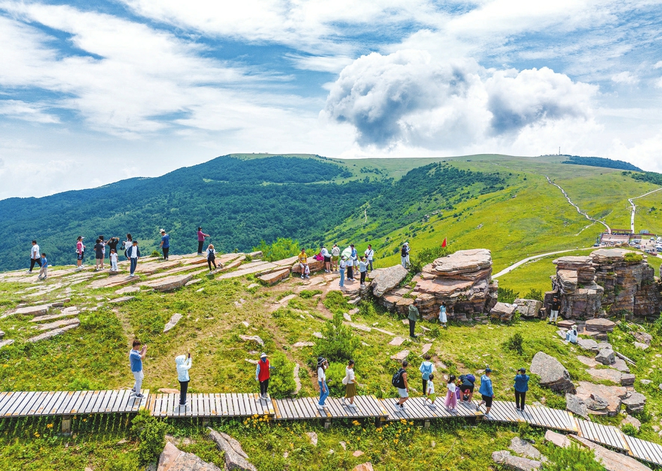 7月28日,垣曲县历山风景区,天上翻滚的白云与地面舜王坪绚丽的花海以及成片的绿色森林交相辉映,构成一幅美丽画卷,吸引众多游客前来观赏游玩。(薛俊摄)
