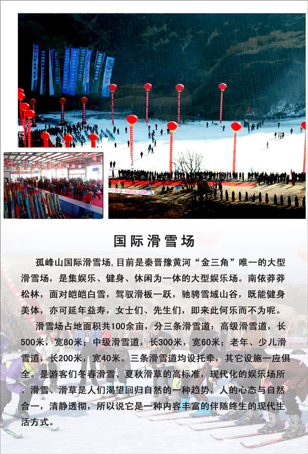 孤峰山景区四季景色变化无常,融融春日,山花烂漫,五彩斑斓;春夏之交,杏蕊梨花,如锦似霞;三伏夏,松涛蝉鸣,似瑟似琴,浓荫蔽日,凉爽宜人;仲秋前后,千峰竟秀;三九严寒,白雪皑皑,冰花玉枝,银装素裹,宛如仙界。