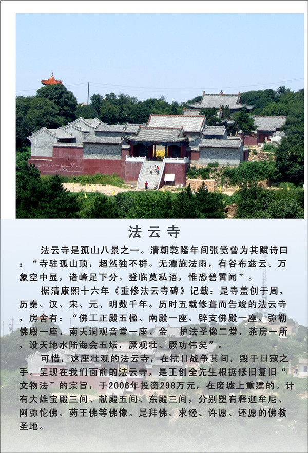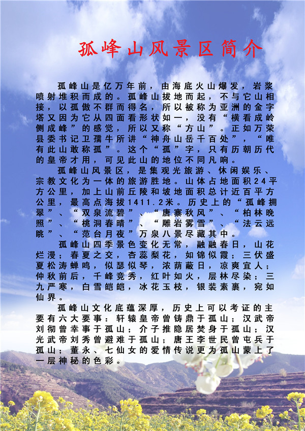 孤峰山景区文化底蕴深厚,历史上可以考证共有六大事件:轩辕黄帝曾铸鼎于孤峰山,汉武帝刘彻曾驾临用事于孤峰山,介子推隐居焚身于此山,光武帝刘秀柏林避难于此山,唐王李世民屯兵孤峰山,董永、七仙女的爱情传说更为孤峰山蒙上了一层神秘的色彩。