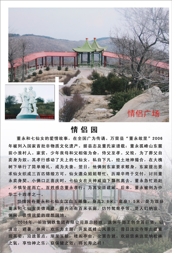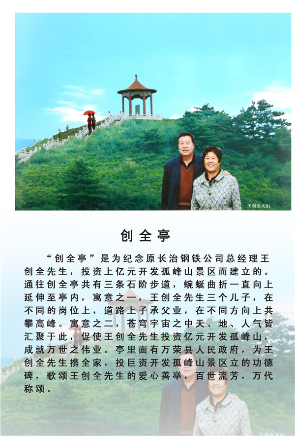 2005年11月,长治全创科工贸有限公司与万荣县人民政府签订了孤峰山旅游开发协议,注册成立了万荣县孤峰山景区开发有限公司,由万荣县孤峰山景区开发有限公司对孤峰山进行整体开发。2006年7月13日市发改委通过了由黑龙江大峡谷旅游规划服务有限公司所编制的万荣县孤峰山旅游景区可行性研究报告,同意景区开发。(运发改社发(2006)20号)