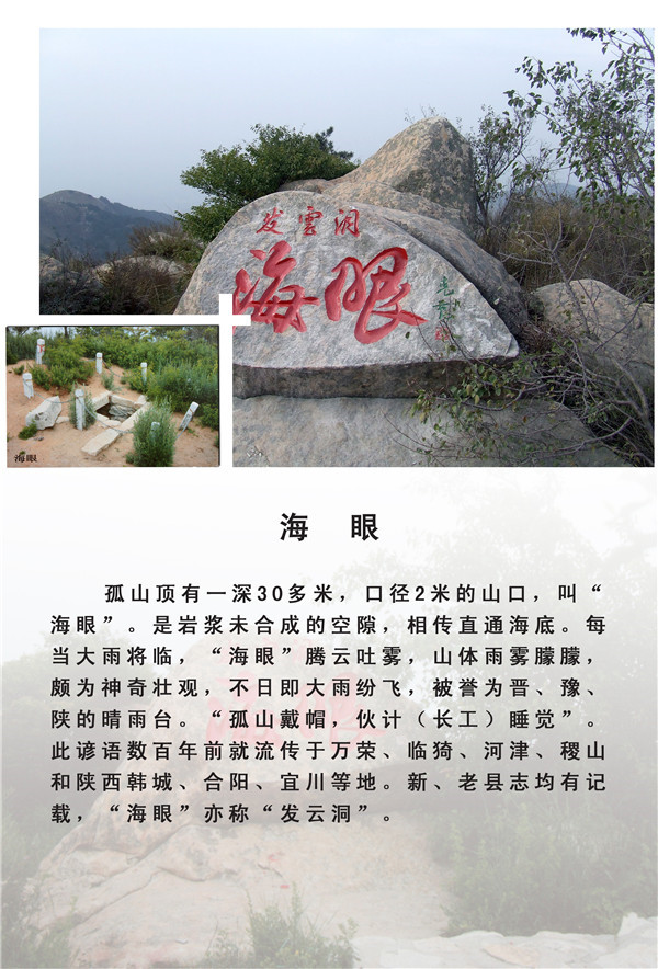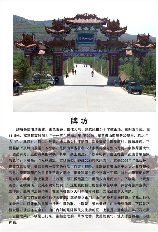 孤峰山景区位于万荣县城正南8公里处,是一处集观光、休闲娱乐、避暑度假、宗教为一体的旅游胜地。它既是一座风景名山,也是一座历史名山 .孤峰山因拔地而起,孤傲不群而著名,因为此山不与它山相接,是唯一一座伟岸孤傲形山体,所以它也被称为亚洲的“金字塔”,又因此山从四面看形状如一,没有“横看成岭侧成峰”的感觉,所以又获方山之称,这就是此山的特别之处,这个“孤”字历朝历代只有最高统治者才能用,可见此山地位的不同凡响,孤峰山山体占地面积40平方公里,加上山前丘陵和坡地面积总计近百余平方公里,最高峰海拔1411.2米。历史上的“双泉流碧”、“唐寨秋风”、“柏林晚照”、“桃洞春晴”、“雕岩霁雪”、“法云远眺”、“范台月夜”等万泉八景尽藏其中。