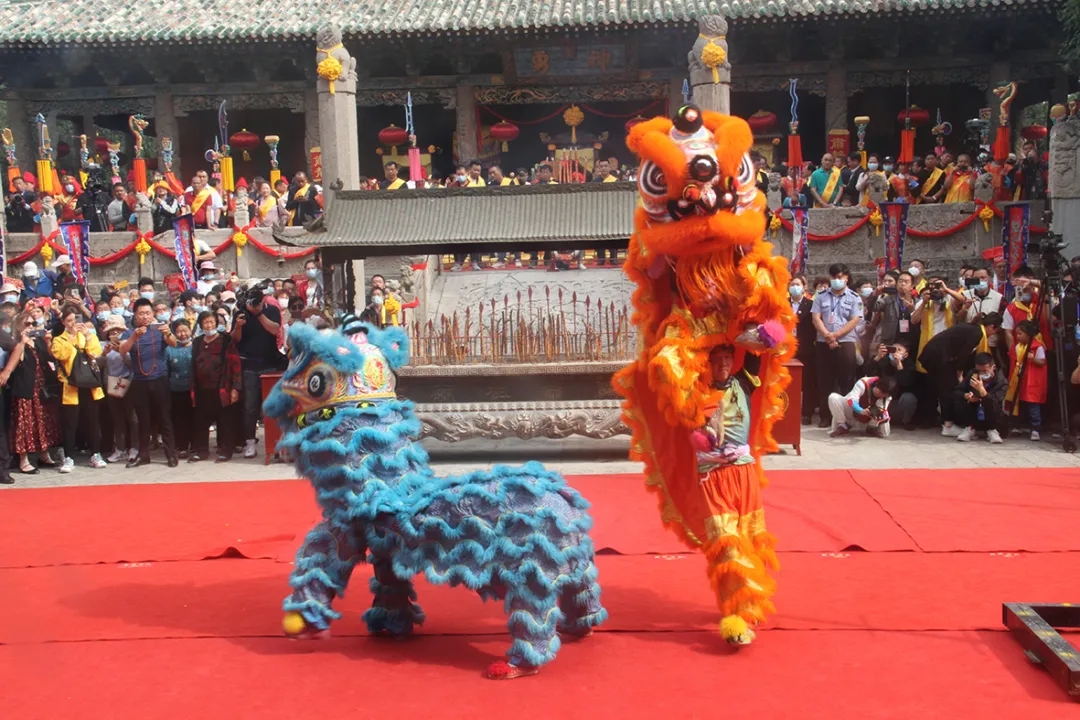 5月19日进行的“关帝巡城”活动是庙会的重头戏。崇宁殿前,关公信众肃立两侧,在充满古朴韵味的袅袅乐音中,舞者们翩翩起舞,令人赏心悦目。随后,两只狮子爬上了高杆,它们调皮地和观众互动,充满生趣。献艺环节之后,“巡城”正式开始。3顶圣轿分别载着明清年间的3尊关公“软身”木雕圣像,离开崇宁殿,走过御书楼,来到了解州街头。两侧群众争相观看,热闹得像过年。