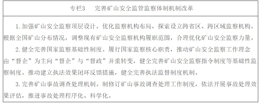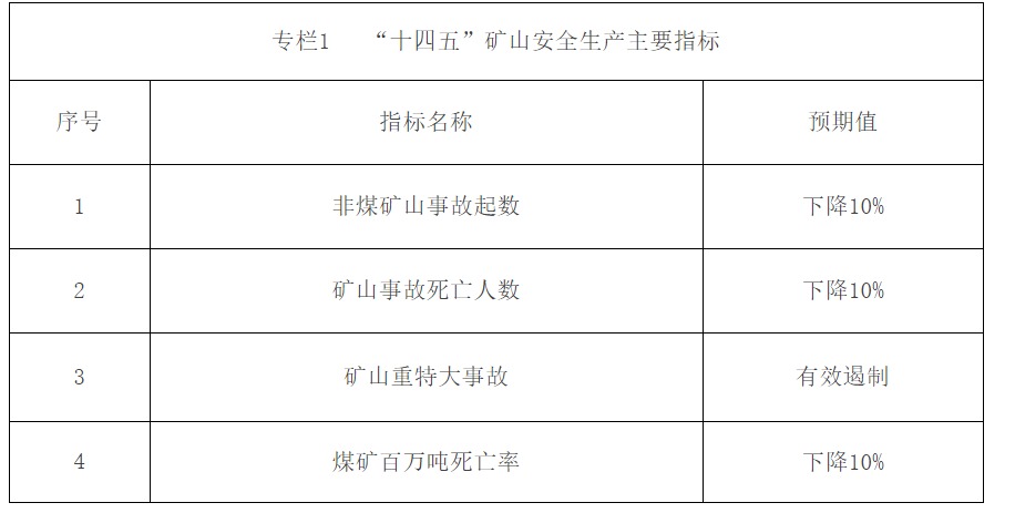 到“十四五”末,矿山安全法规标准体系更加完备、安全生产责任体系更加健全、安全预防控制体系更加科学、安全监管监察体制更加完善、信息化智能化水平大幅提高、基础保障能力明显增强、监管监察效能显著提升,矿山安全综合治理效能取得重大进展,事故总量持续下降,重特大事故得到有效遏制。