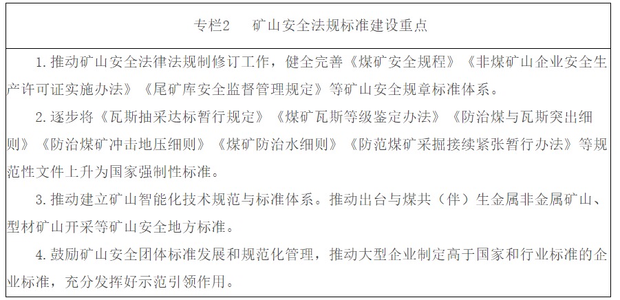 坚持和巩固政府引导、社会参与、市场驱动、协同推进的标准化工作格局。组建全国矿山安全标准化技术委员会,申请新增矿山安全行业标准代号(KA),将煤矿和非煤矿山安全生产行业标准科学分类优化整合为矿山安全行业标准。完善矿山安全标准制修订工作机制,强化智能化装备、灾害防治、装备安全技术条件等急需短缺标准制修订,增加标准有效供给。鼓励社会力量广泛参与开展标准规范的制修订工作。及时公开国家、行业、地方标准,强化标准宣贯培训和实施评估,充分发挥标准对矿山企业现场安全管理和安全监管监察执法的支撑作用。