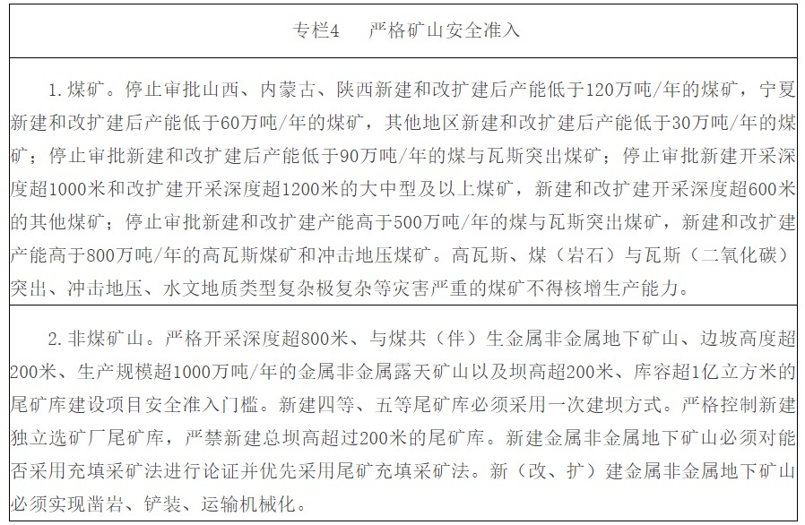 进一步提高深部开采、煤与瓦斯突出、高瓦斯、冲击地压、水文地质类型复杂极复杂等灾害严重煤矿安全准入条件。推动相关部门进一步提高铁、铜、金、石灰石等重点矿种最小开采规模和最低服务年限标准,提升非煤矿山规模。严格执行等量或减量置换政策控制尾矿库总量,严禁新建“头顶库”。进一步提升矿山装备、队伍安全准入标准,强化生产工艺、技术、设备和材料安全准入以及从业人员安全素质准入。严格安全设施设计审查,加强对安全设施竣工验收和验收结果的监督核查。