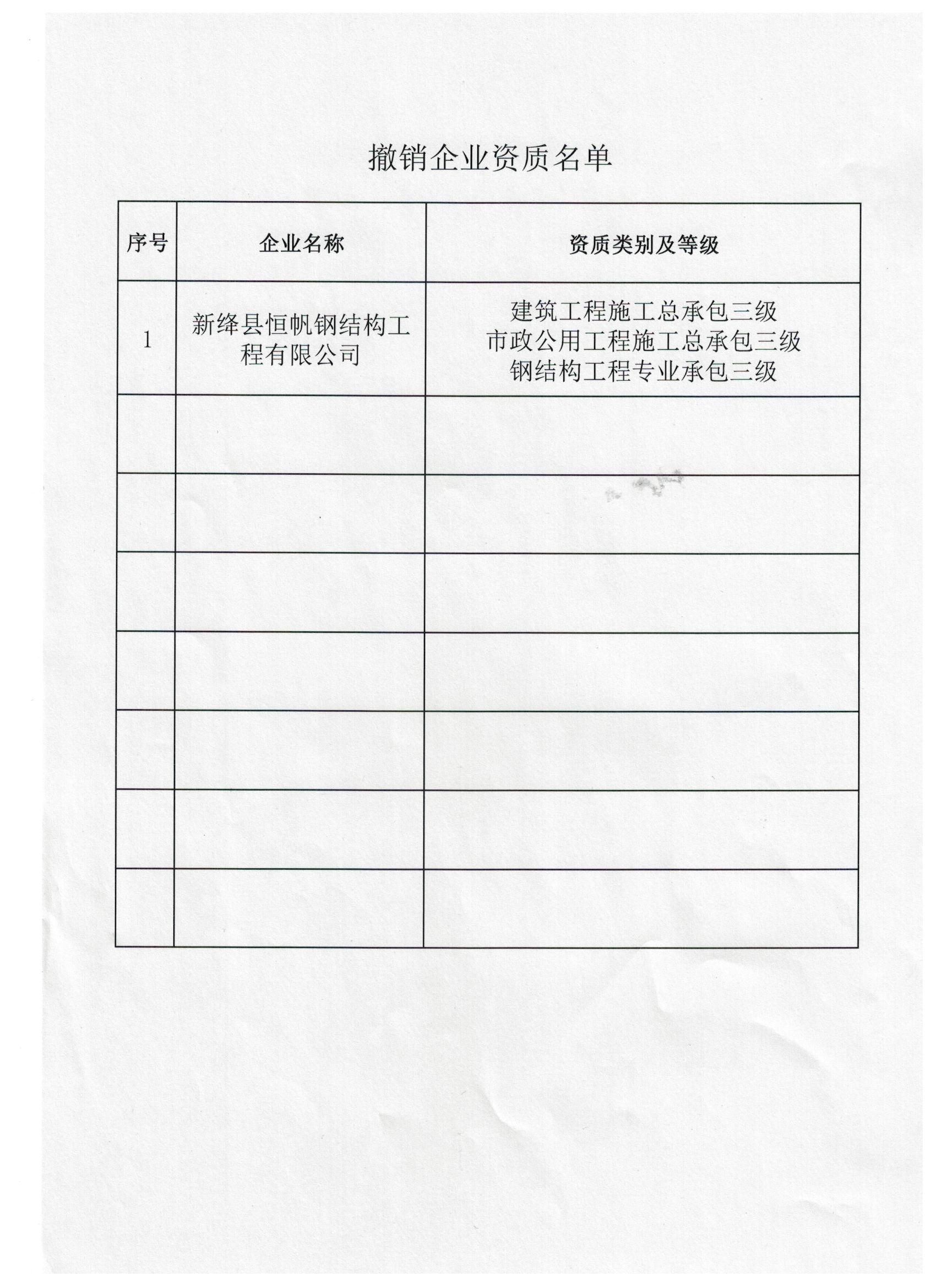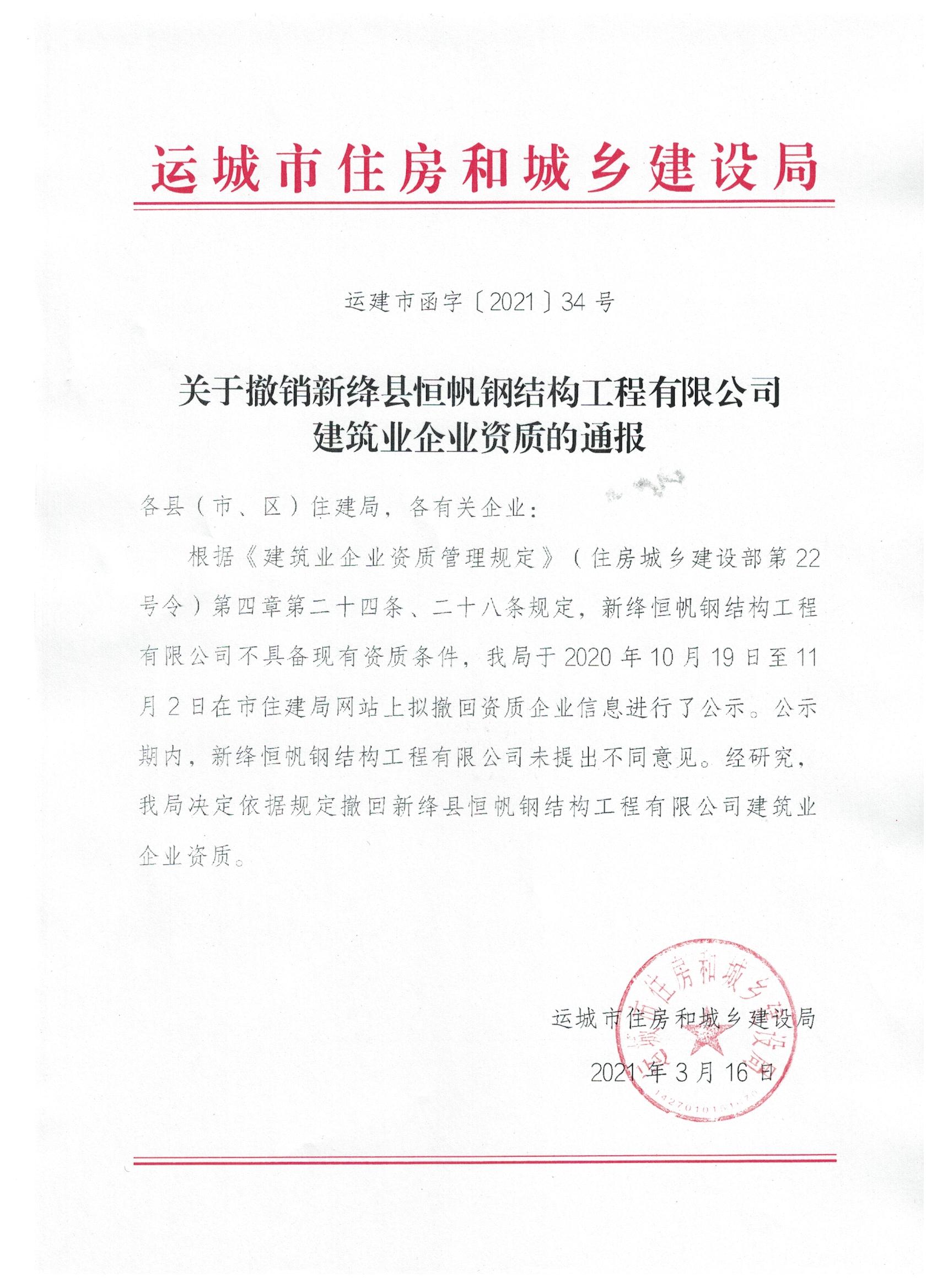 关于撤销新绛县恒帆钢结构工程有限公司建筑业企业资质的通报