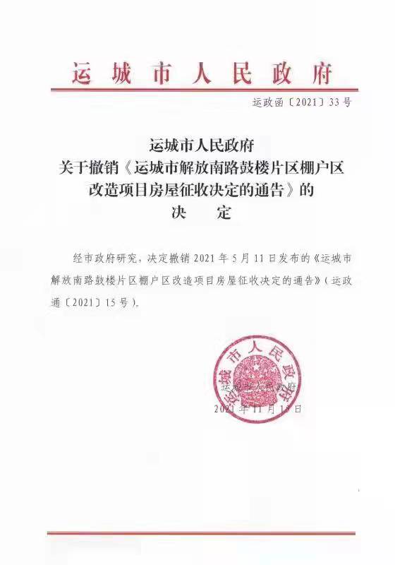 关于撤销《运城市解放南路鼓楼片区棚户区改造项目房屋征收决定的通告》